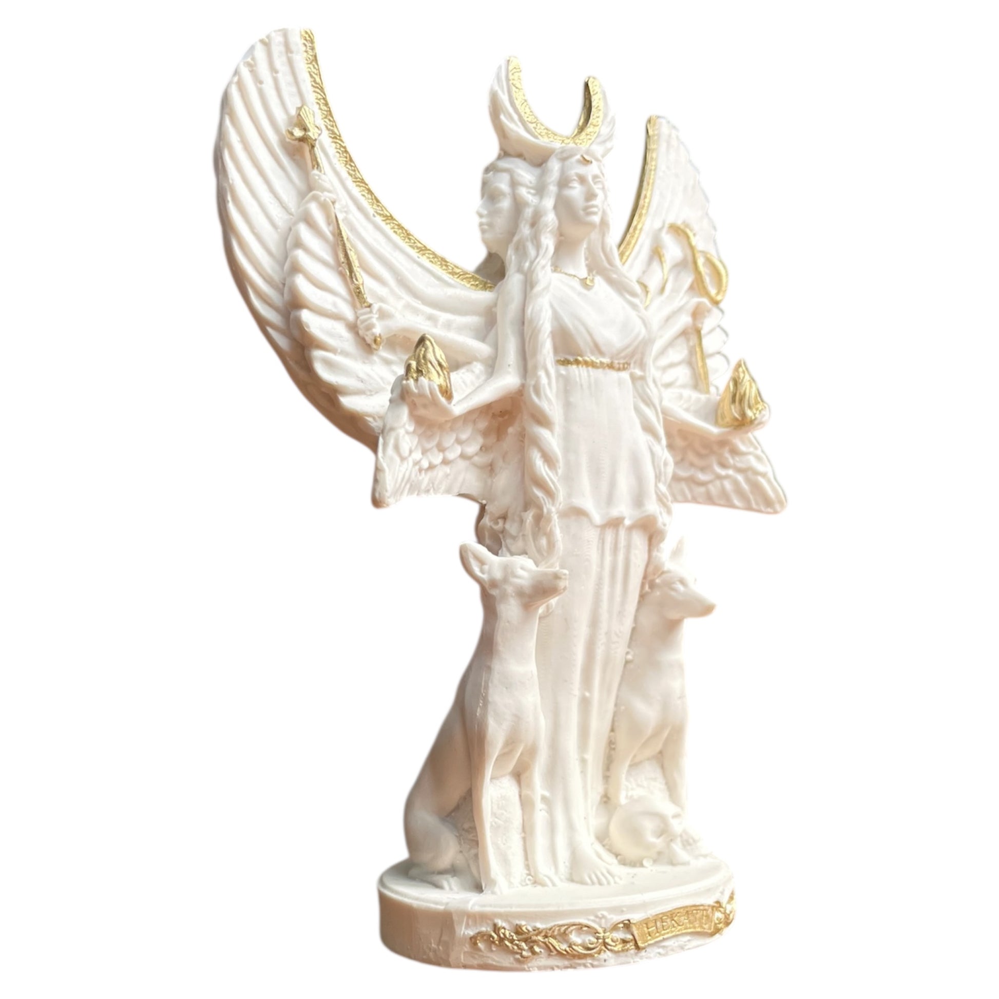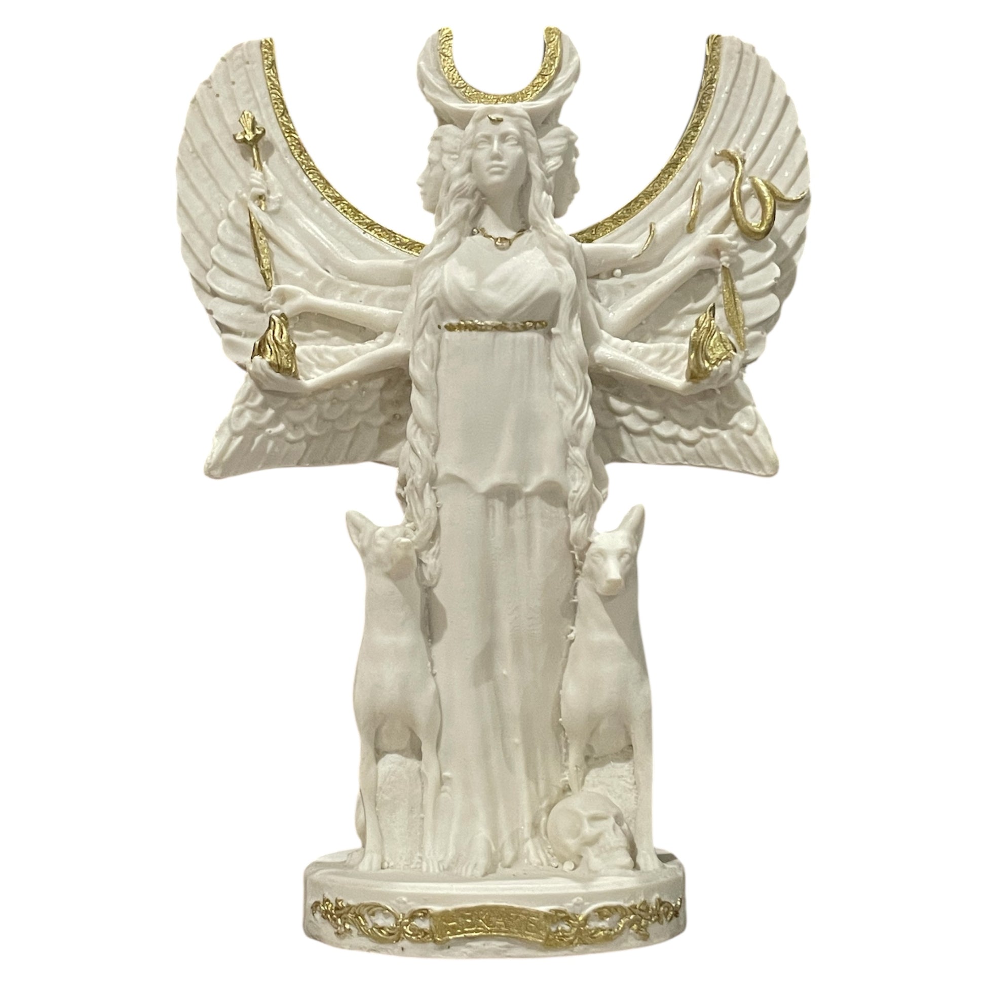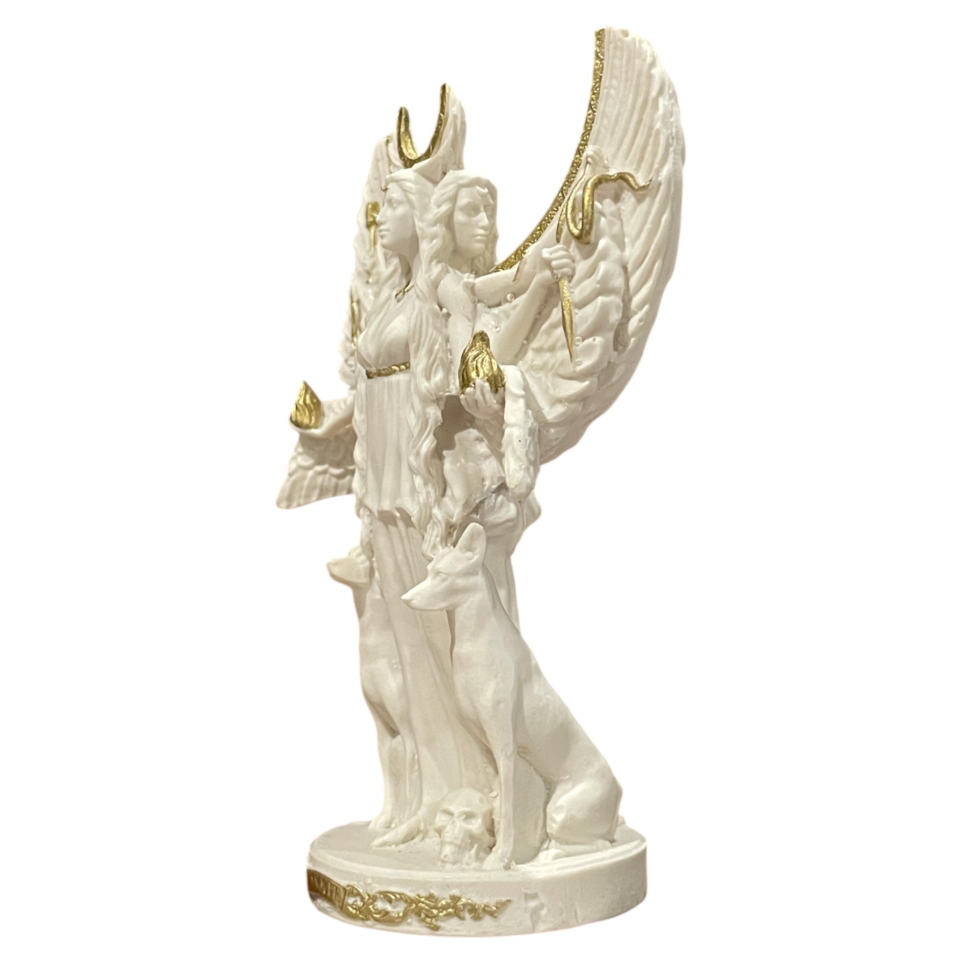 Escultura de la Diosa Hécate elaborada en resina de alta calidad. Con dimensiones precisas de 12 cm de alto, 9 cm de ancho y 5 cm de profundidad, esta pieza en color blanco captura la esencia de la deidad griega asociada con la magia, las encrucijadas y la protección. Ideal para altares, espacios rituales o como elemento decorativo para conocedores de la tradición esotérica.