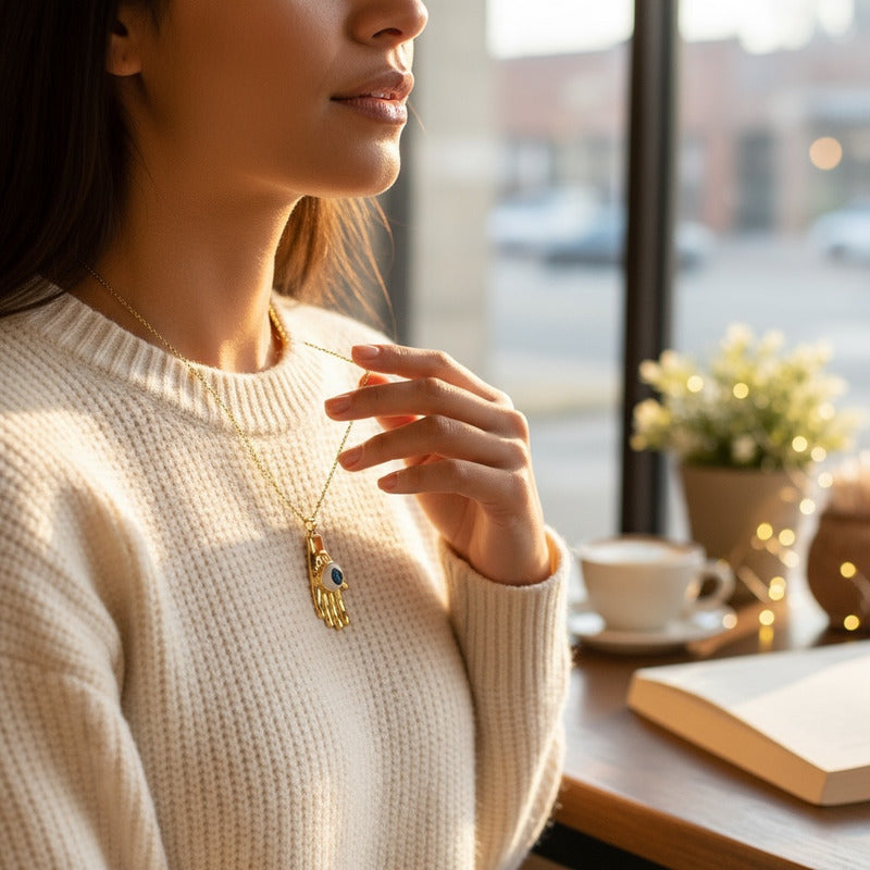 Mano Con Ojo Dije Con Cadena En Metal Dorado