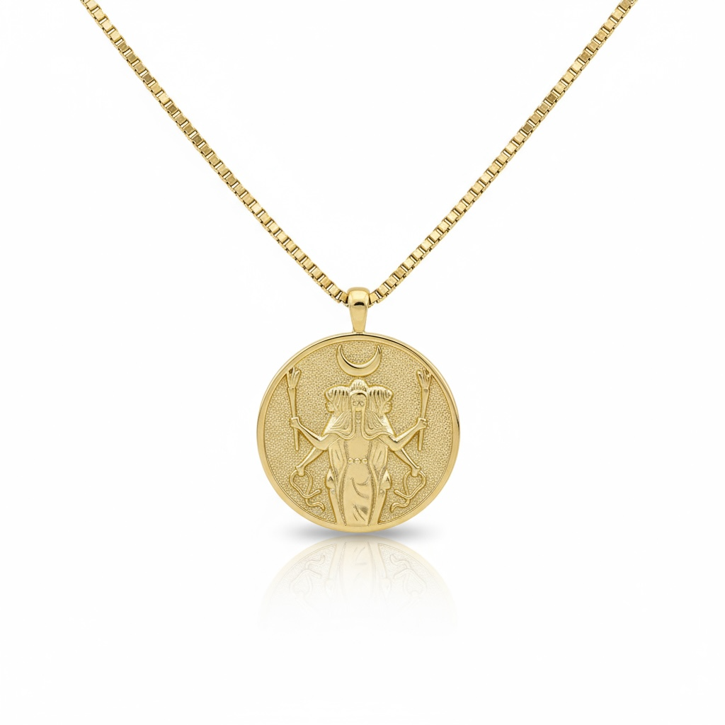 Esta medalla dorada de la Triple Diosa, acompañada de una delicada cadena, es una pieza que combina simbolismo y elegancia. Representa las tres fases de la mujer y puede brindar una conexión espiritual profunda. Su acabado en dorado asegura un brillo duradero, ideal para complementar diversos estilos con un toque sofisticado y significativo. Perfecta para quienes buscan un accesorio con valor cultural y estético.