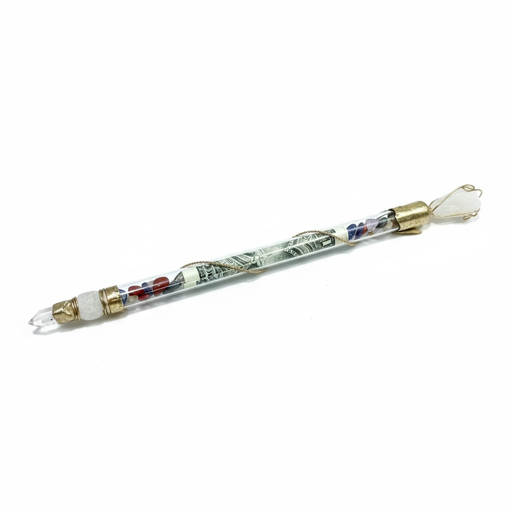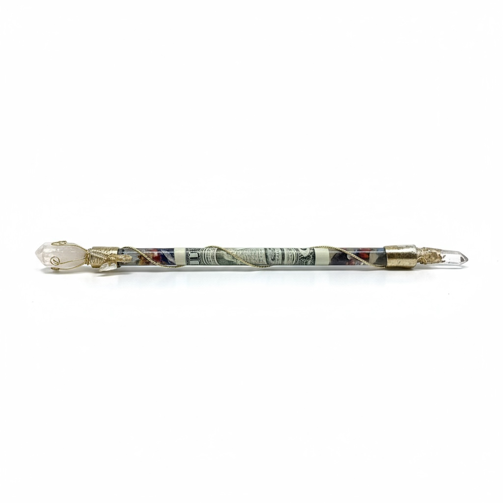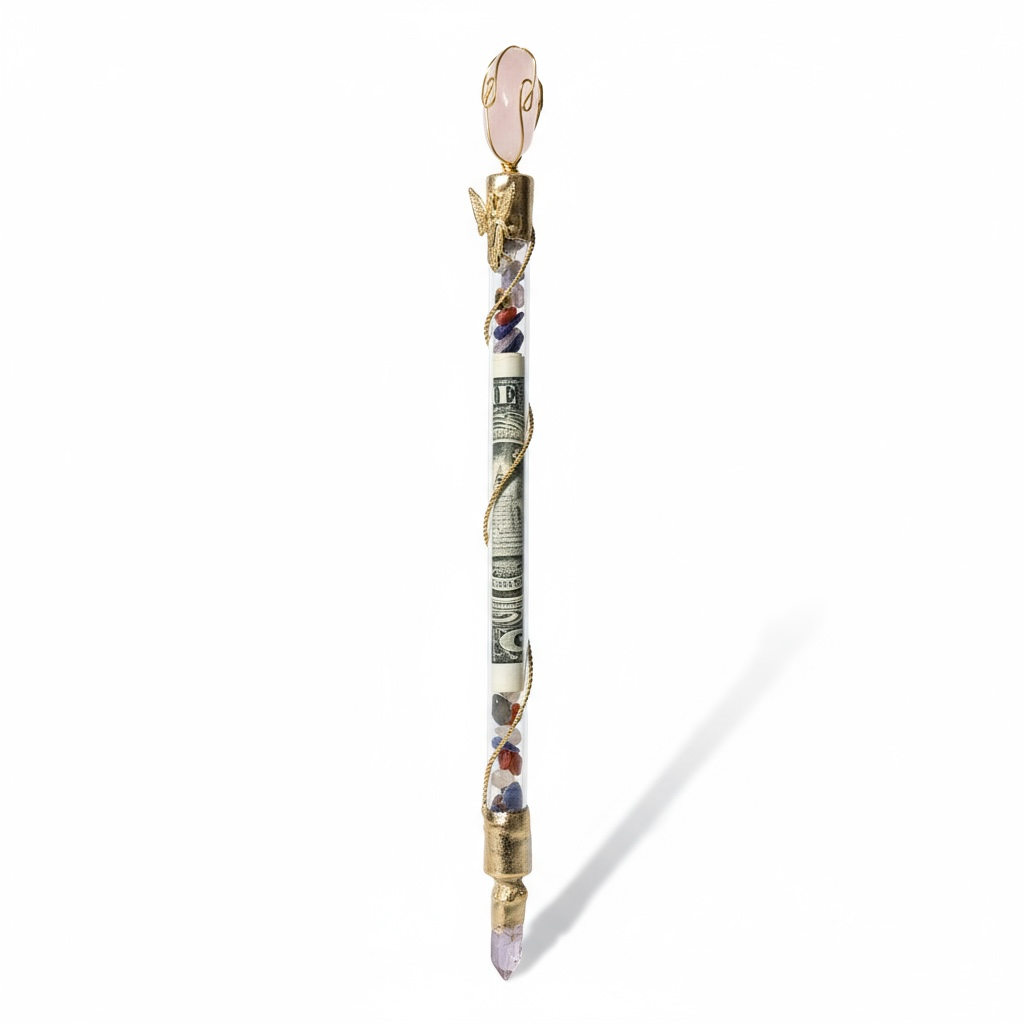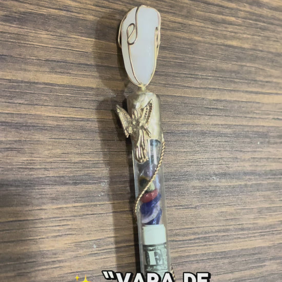 Esta vara de poder dorada, elaborada a mano con cuarzos, representa la auténtica artesanía mexicana. Cada pieza es única, ya que los colores y dijes pueden variar, reflejando la individualidad y dedicación de su creación artesanal. Perfecta para quienes valoran la energía natural de los cuarzos y buscan un objeto con significado y belleza exclusiva.