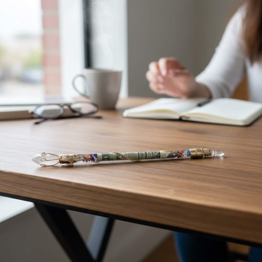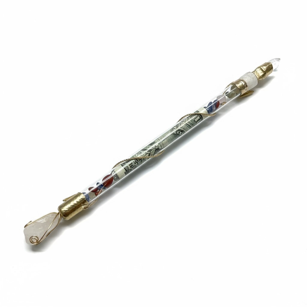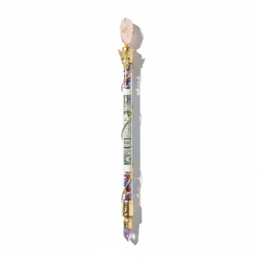 Esta vara de poder dorada, elaborada a mano con cuarzos, representa la auténtica artesanía mexicana. Cada pieza es única, ya que los colores y dijes pueden variar, reflejando la individualidad y dedicación de su creación artesanal. Perfecta para quienes valoran la energía natural de los cuarzos y buscan un objeto con significado y belleza exclusiva.